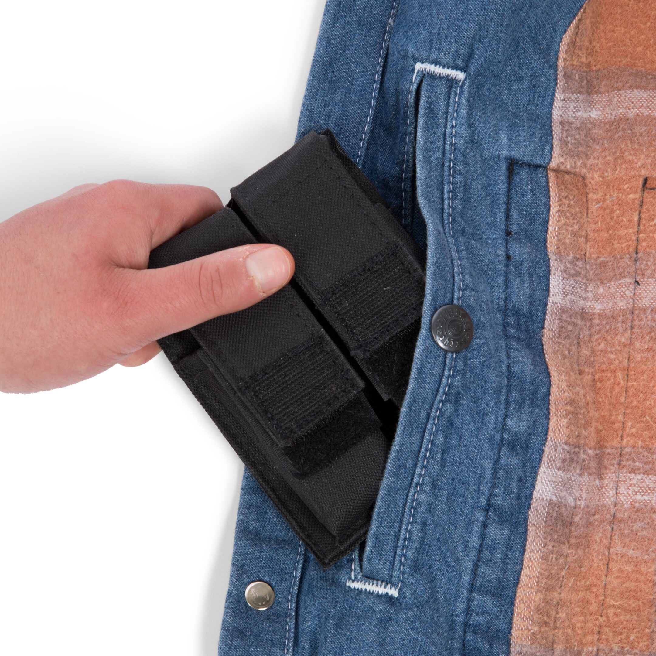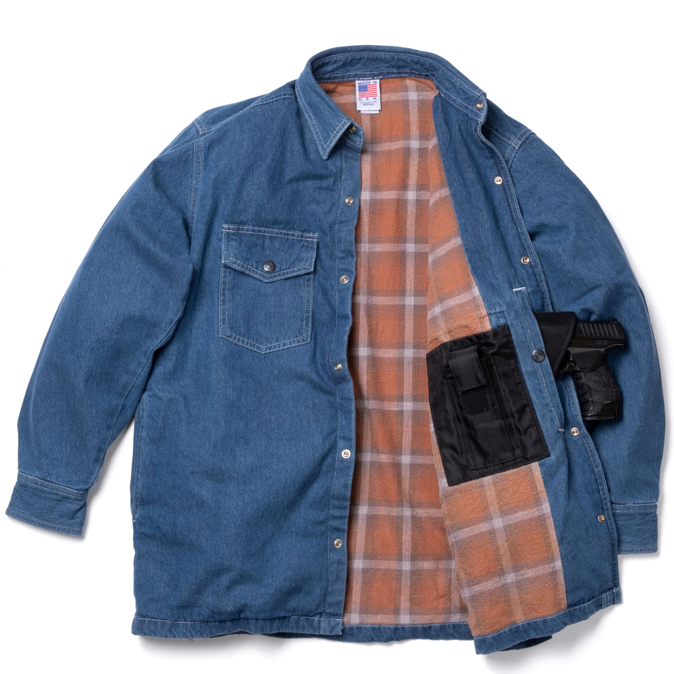 The lightweight Tyca Tactical stonewashed shirt jacket combines rugged utility with classic denim style. Crafted from high-quality 10-ounce denim and made in the USA, it features a quick access snap button front closure and cuffs for a comfortable fit. The jacket features two inside concealed carry pockets, strategically placed to allow for discreet and secure carry of your firearm and four extra magazines. With a soft, broken-in feel, this jacket is perfect for everyday wear or outdoor adventures.